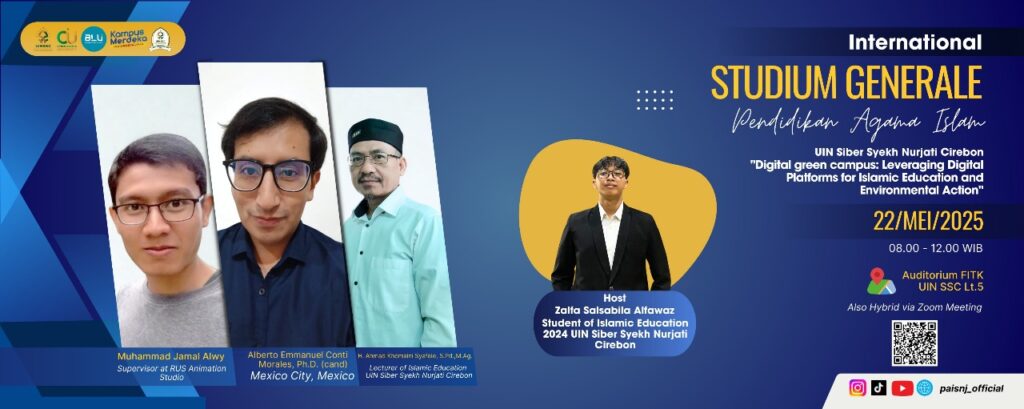 Cirebon, 22 Mei 2025 —PAI UIN Siber Cirebon Gelar Studium General Internasional Bertema Kampus Hijau Digital Islami sebagai Respons terhadap Krisis Iklim Global Menyikapi krisis iklim global, Jurusan Pendidikan Agama Islam UIN Siber Syekh Nurjati Cirebon menyelenggarakan Studium General Internasional bertema “Digital Green Campus: Leveraging Digital Platforms for Islamic Education and Environmental Action.” Acara yang diselenggarakan secara hybrid ini tidak sekedar wacana lingkungan, tetapi menjadi ruang strategis untuk membangun visi Kampus Hijau Digital Islami, yakni kampus masa depan yang memadukan teknologi, nilai keislaman, dan kepedulian ekologis dalam satu napas.